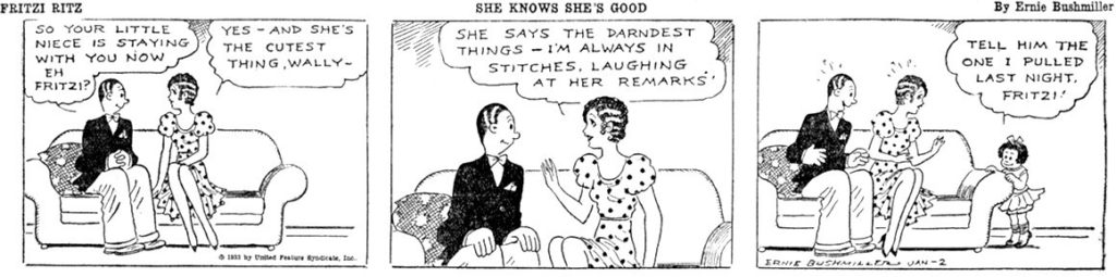 Ernie Bushmiller, qui privilégiait le gag visuel plutôt que le dialogue, construisait ses planches comme de petits mécanismes logiques dans lesquels chaque élément du décor était posé pour servir le gag final, parfois absurde, voire surréaliste.